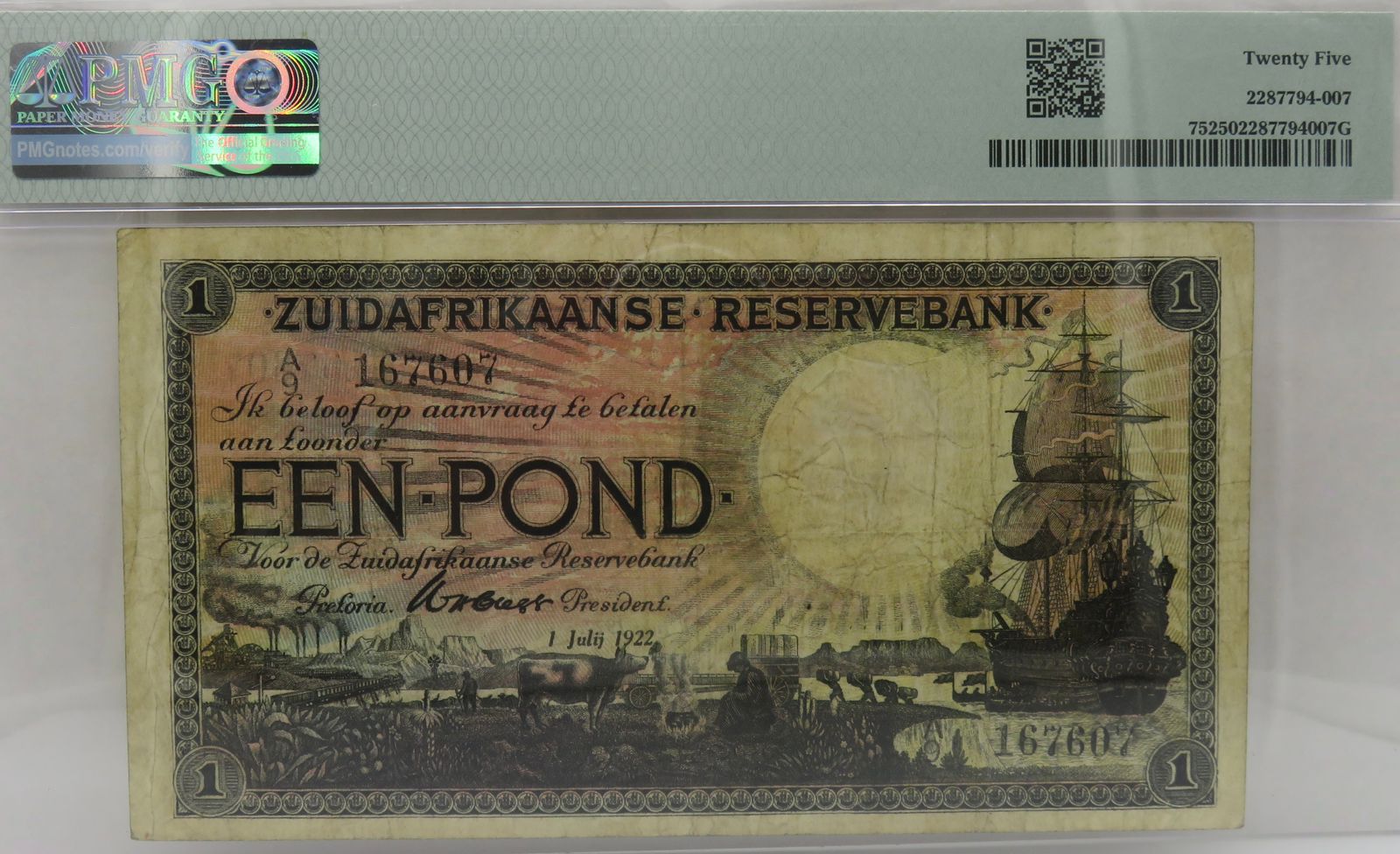 Lot 8: South Africa: Reserve Bank One Pound “W.H. Clegg” of 1922 PMG Very Fine 25.