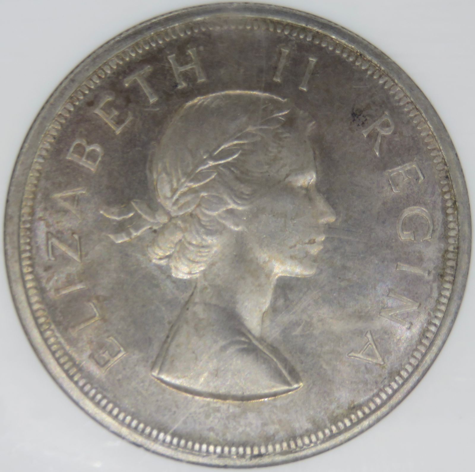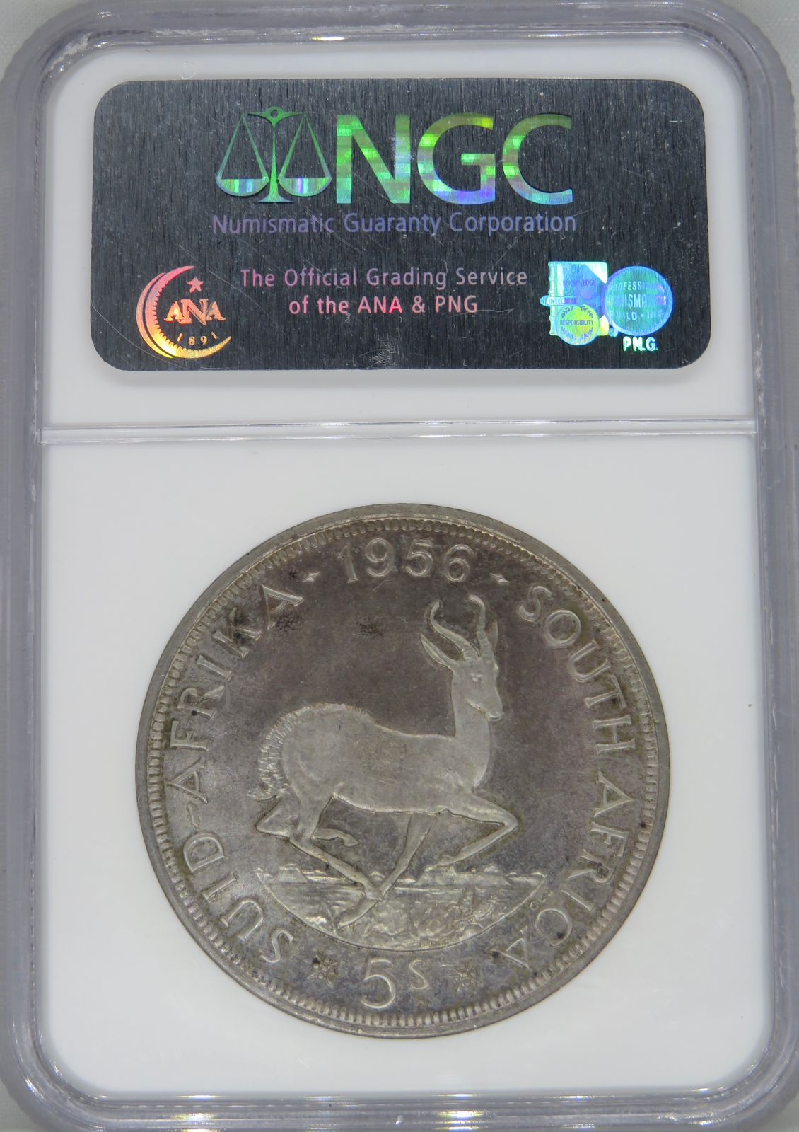 Lot 8: South Africa: Union Elizabeth II Silver 5 Shillings (Crown) of 1956 PL 65 NGC.