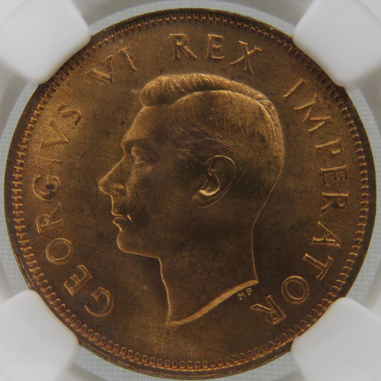 Lot 8: South Africa: Union George VI bronze half penny of 1945 MS 64 Red & Brown NGC.