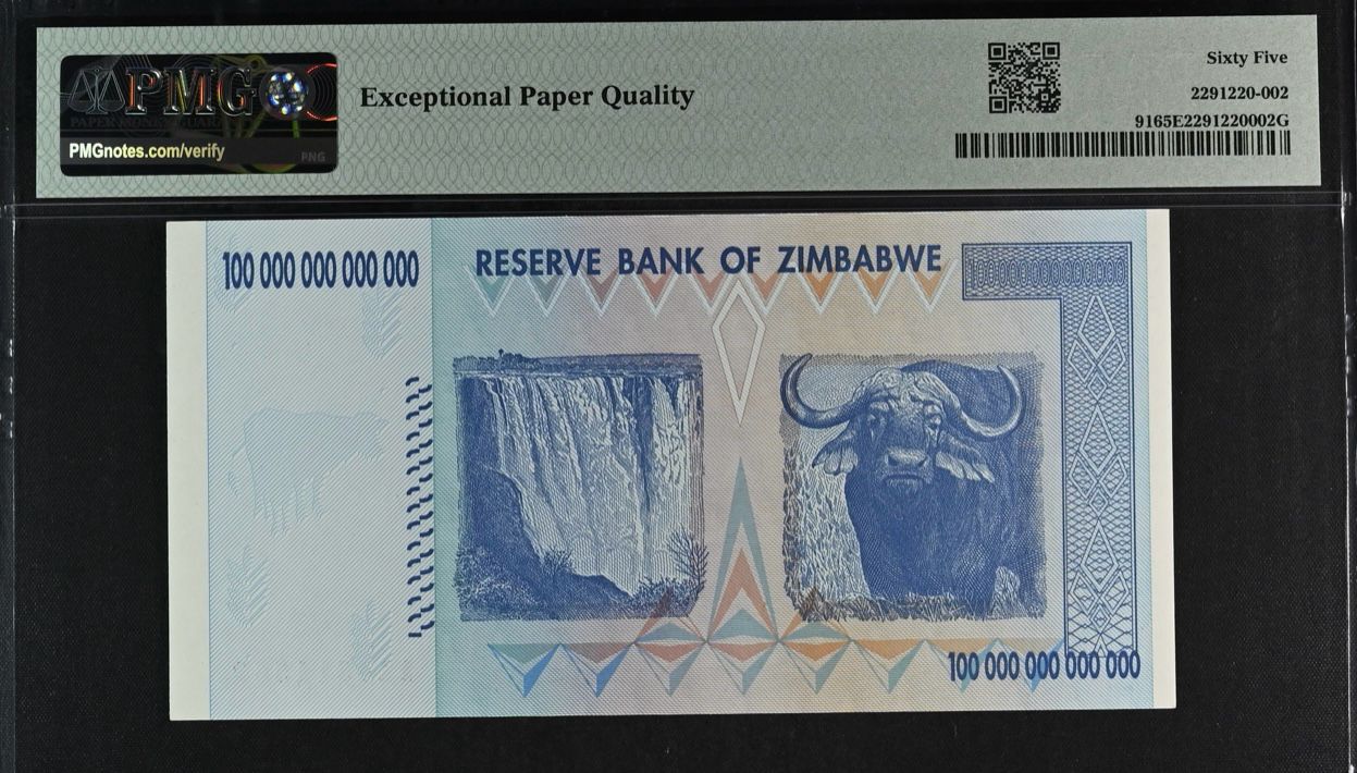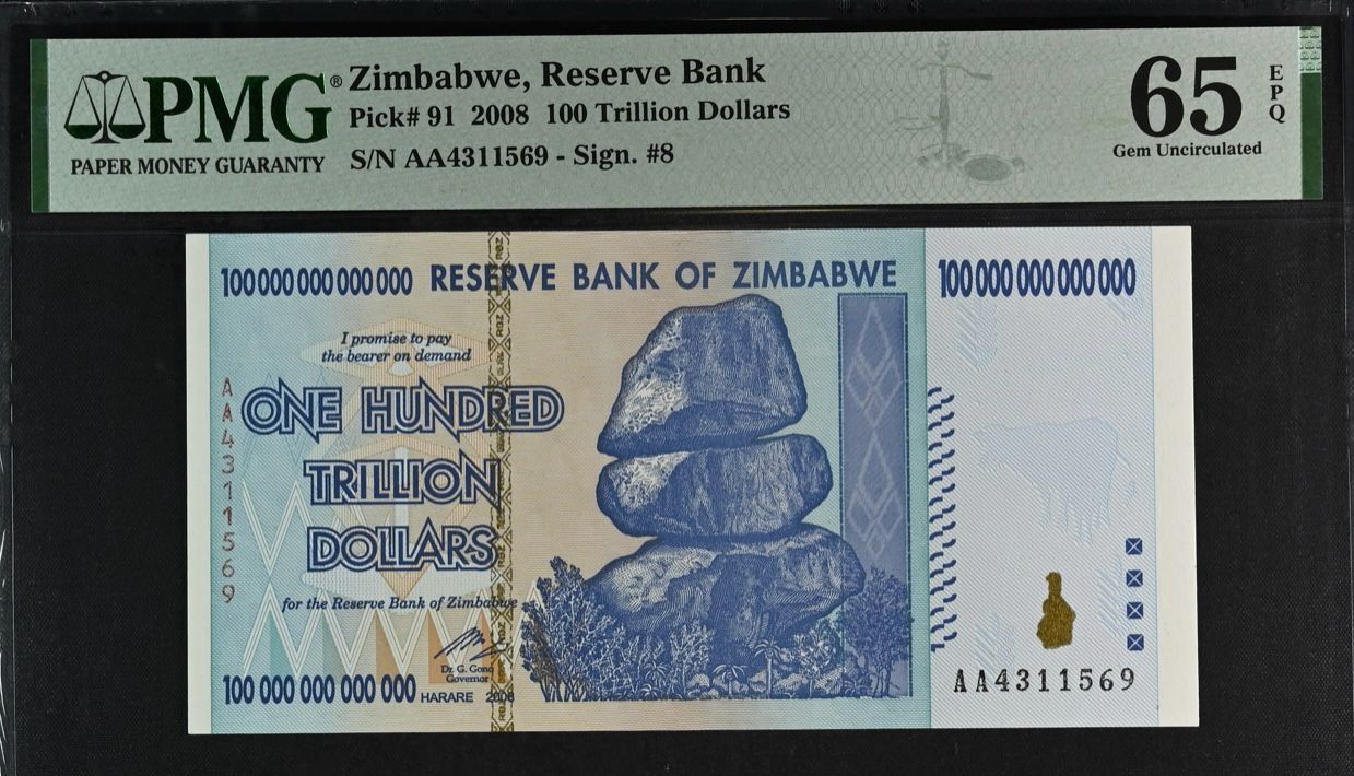 Zimbabwe: Reserve Bank 100 Trillion Dollars of 2008 PMG Graded Choice Uncirculated 65 EPQ.