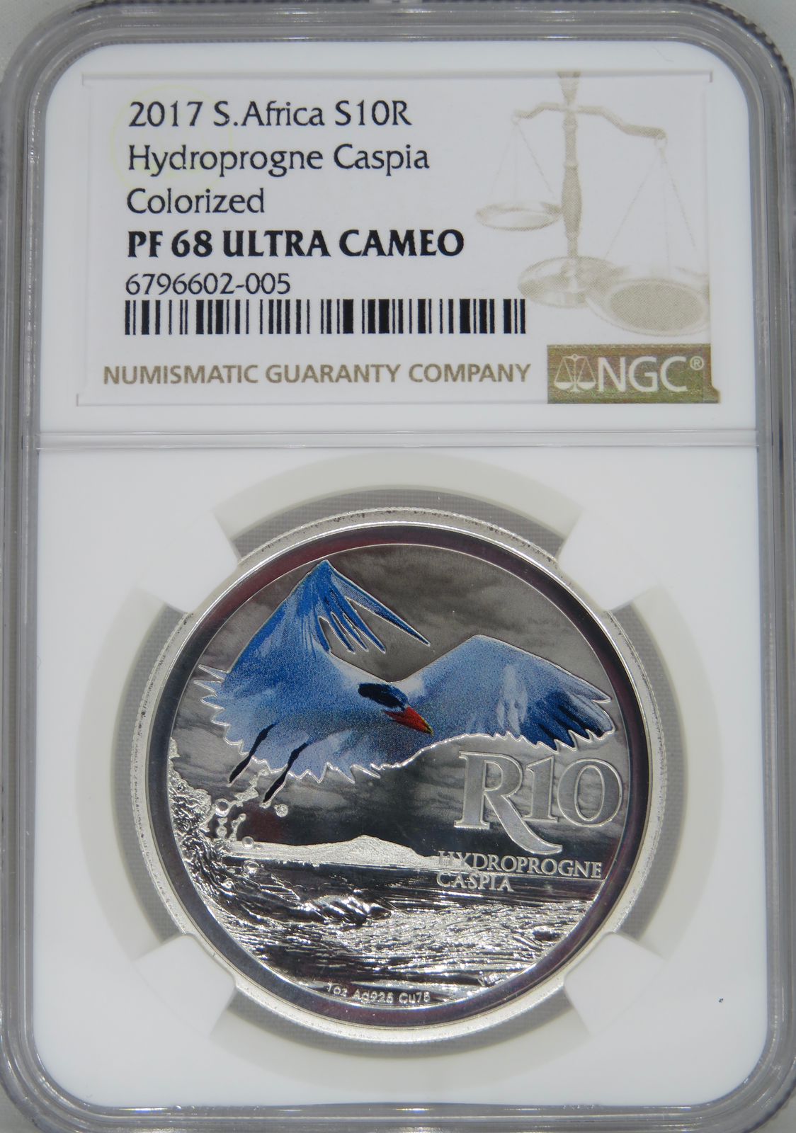 South Africa: Republic “Hydroprogne Caspia” (Caspian Tern) Colourized R10 (1oz Silver) of 2017 Proof 68 NGC.