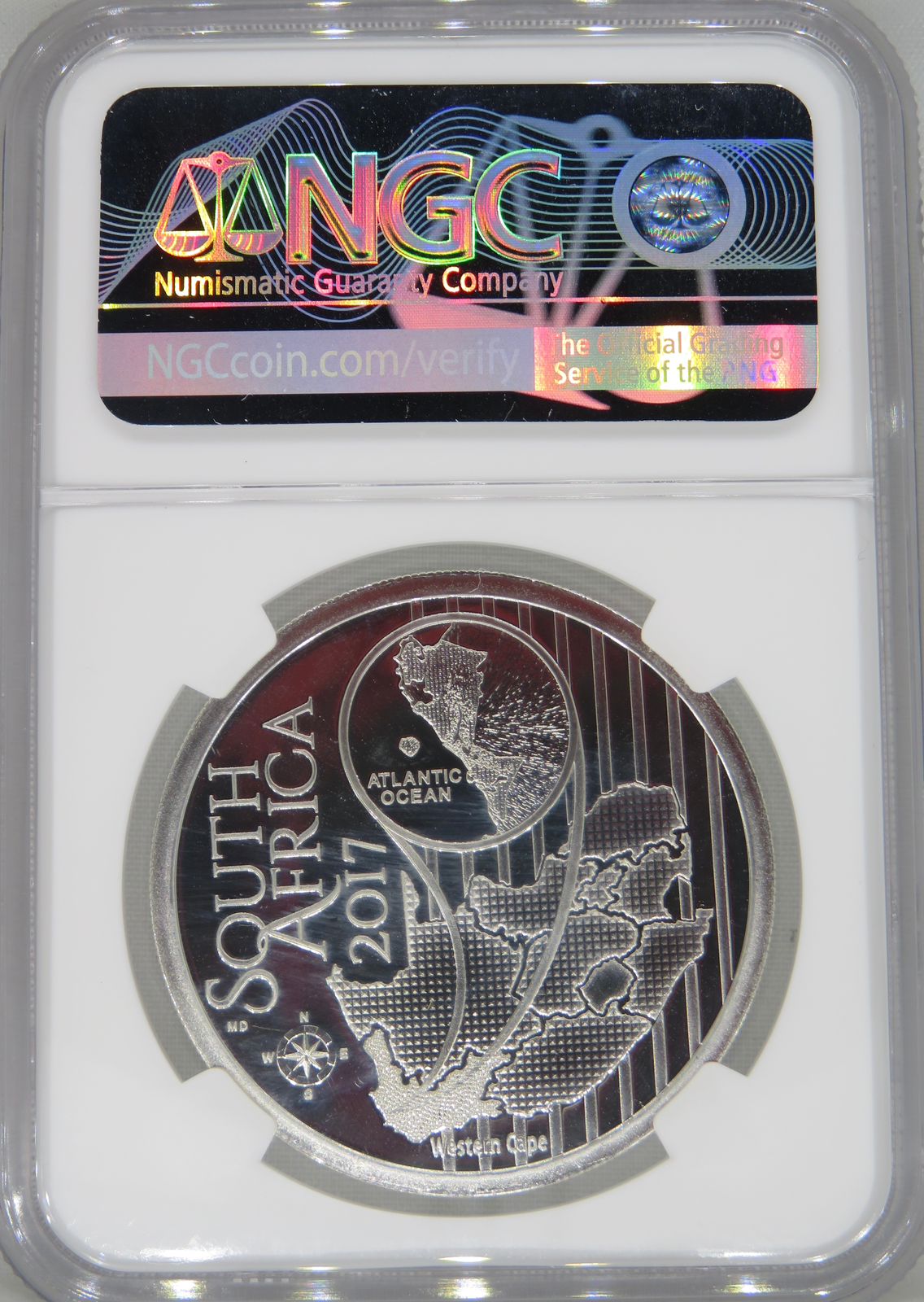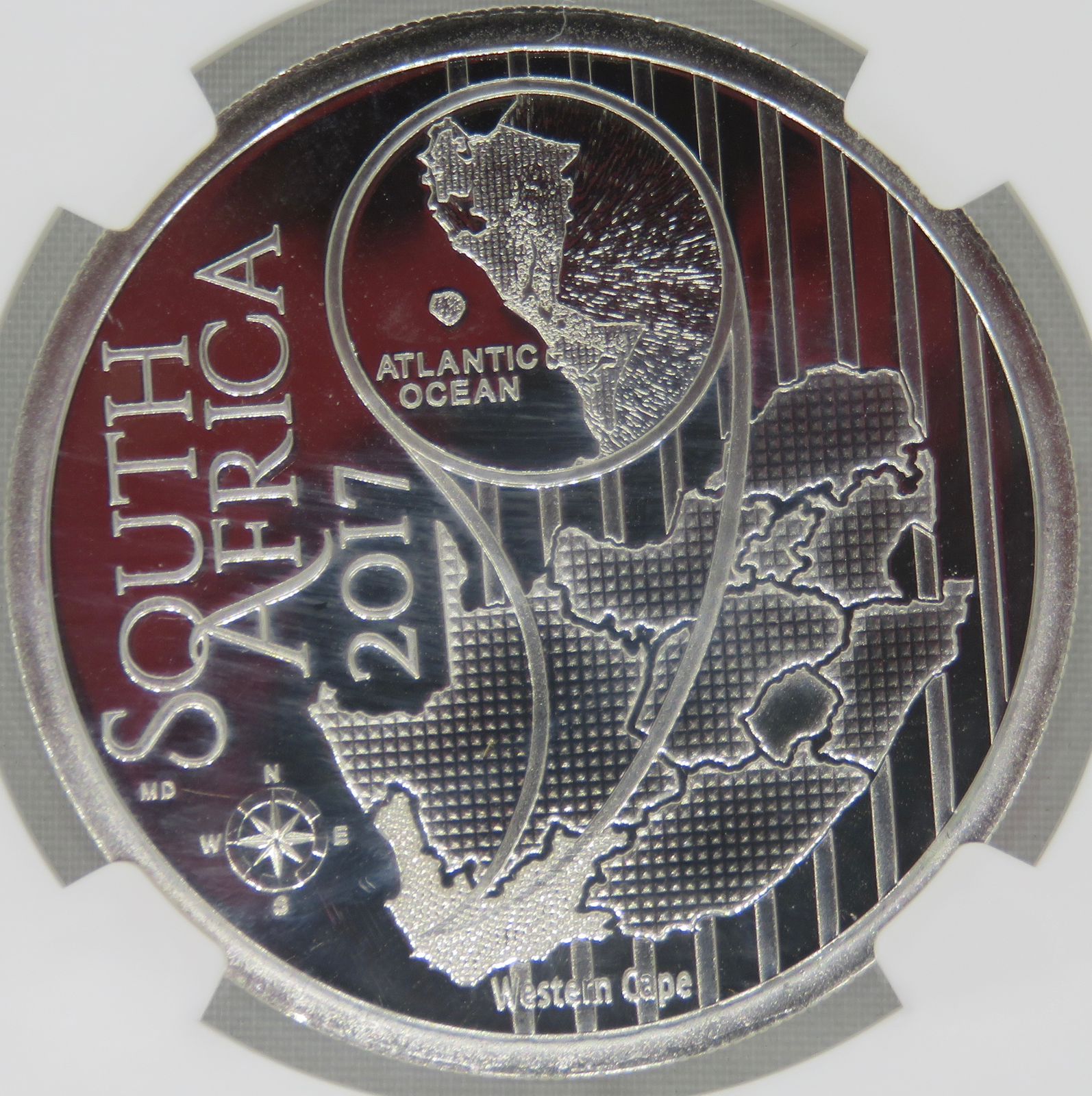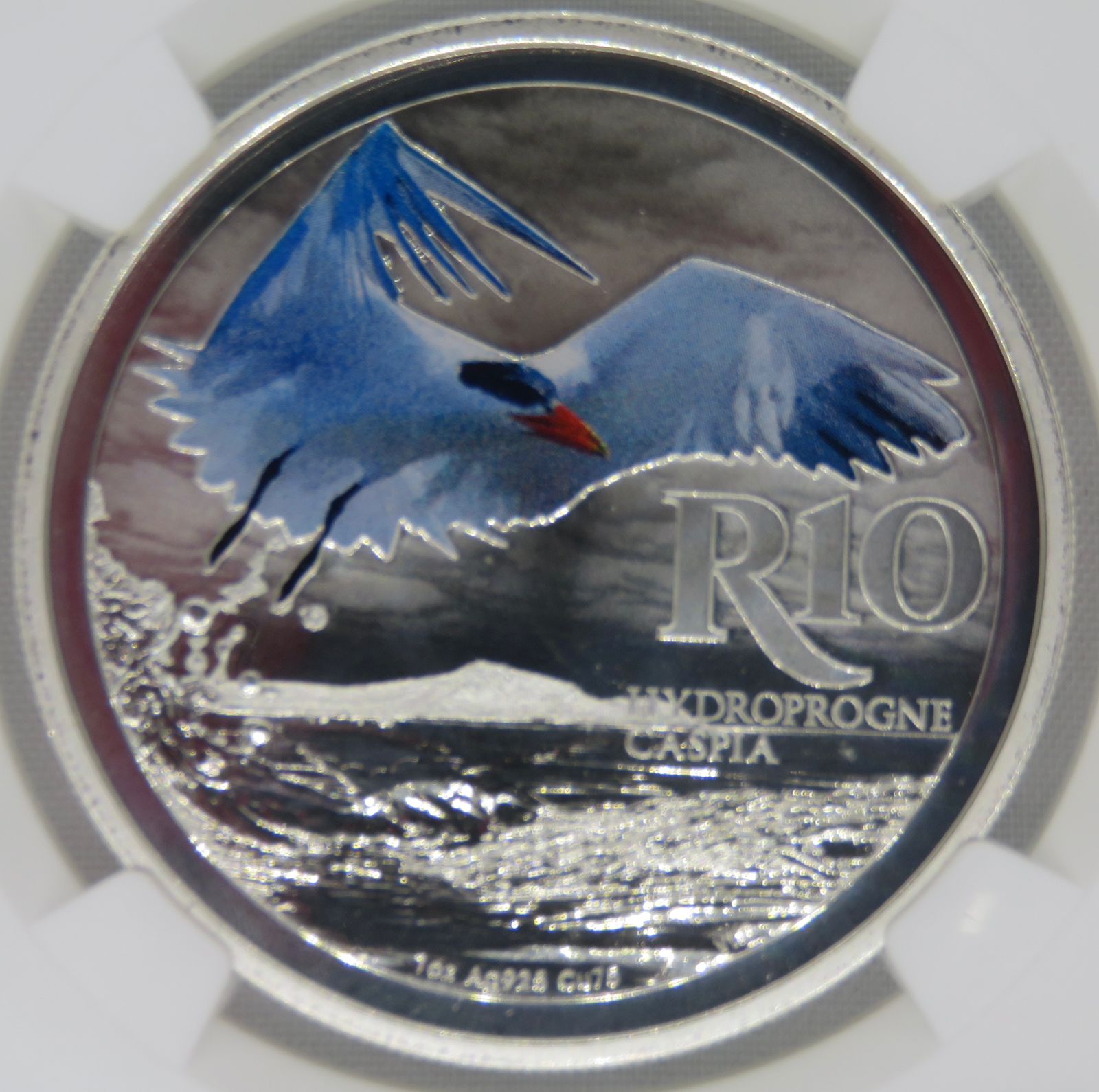 Lot 81: South Africa: Republic “Hydroprogne Caspia” (Caspian Tern) Colourized R10 (1oz Silver) of 2017 Proof 68 NGC.