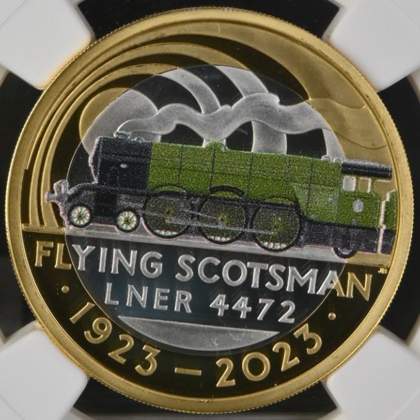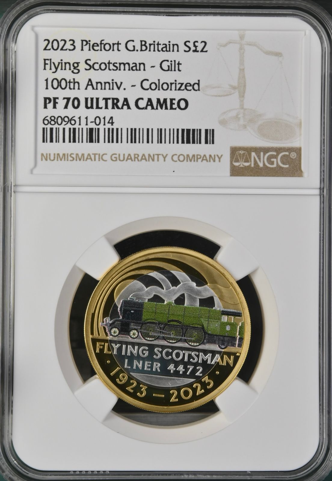 Lot 9: Great Britain: Charles III gilt-silver proof colorized “Flying Scotsman” 2 Pounds of 2023 Proof 70 NGC.