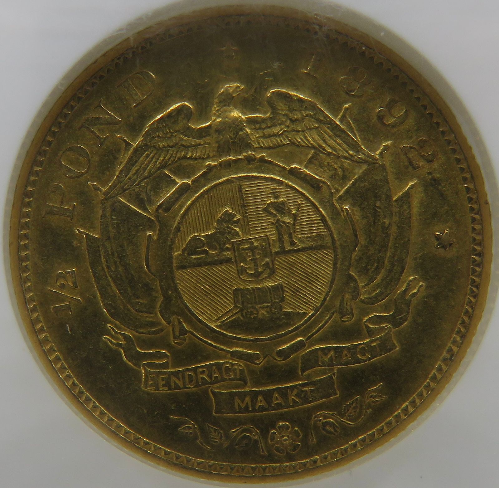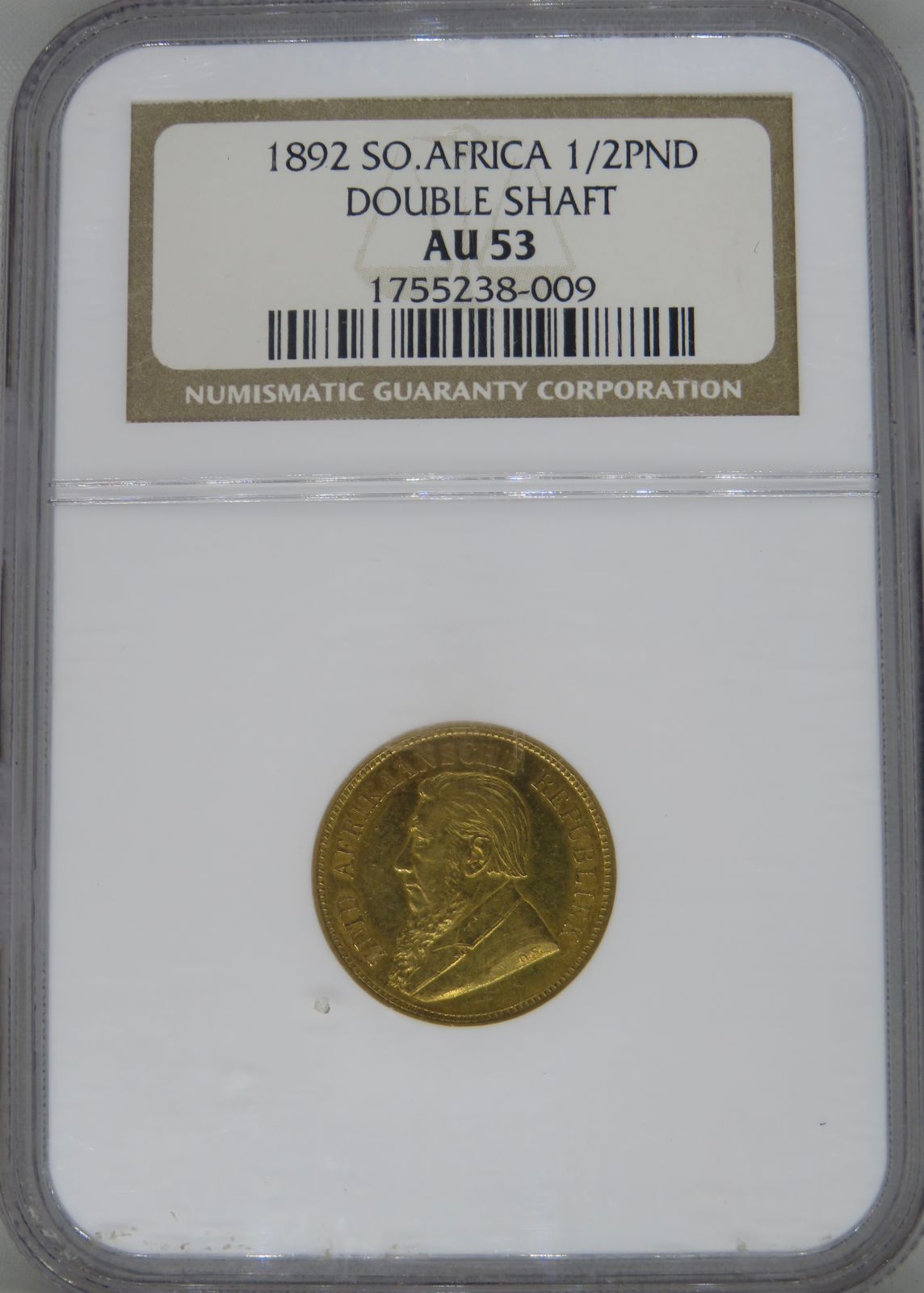 South Africa: Paul Kruger ZAR gold Halfpond “Double Shaft” of 1892 AU 53 NGC.
