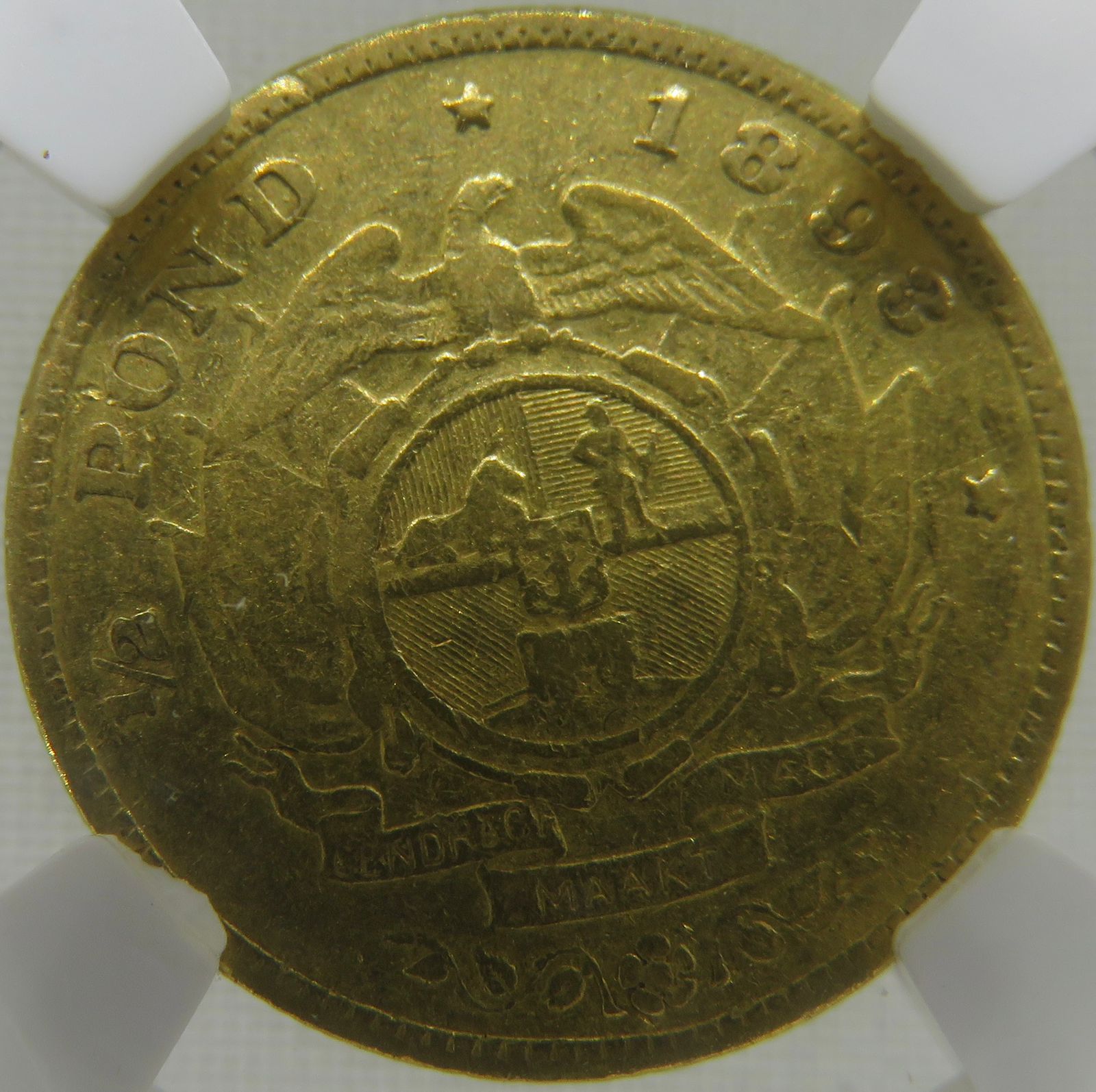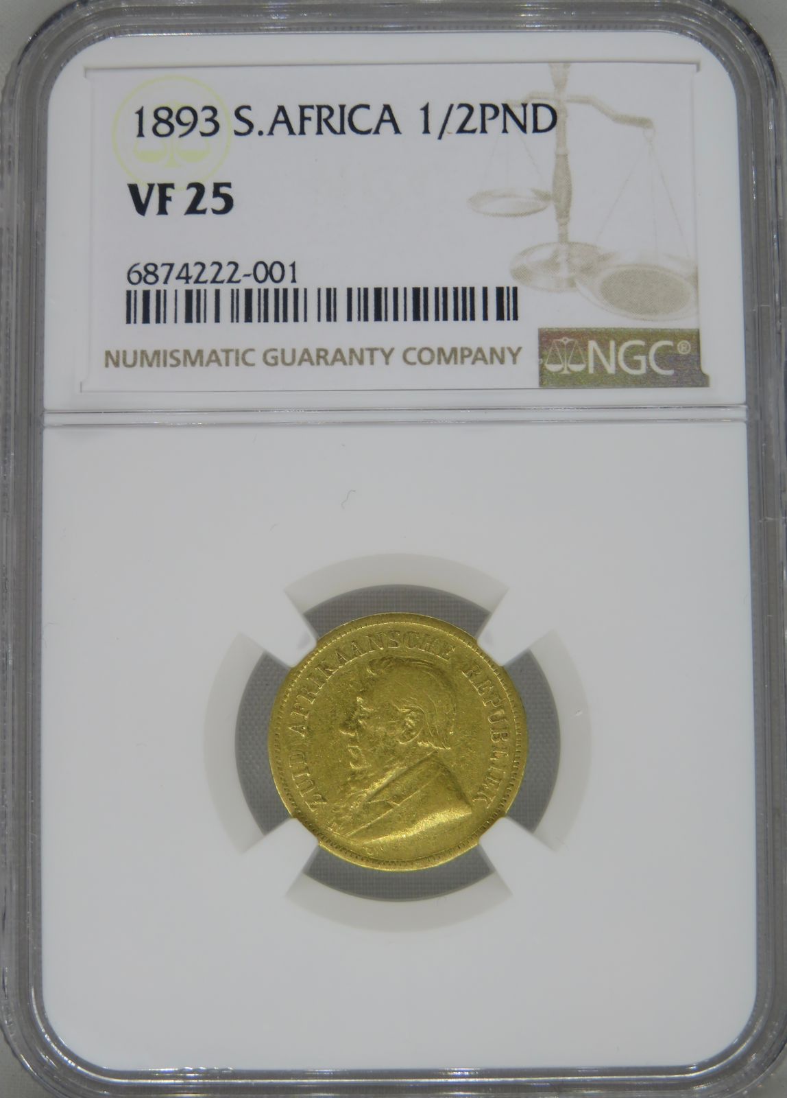 South Africa: Paul Kruger ZAR gold halfpond of 1893 VF 25 NGC.