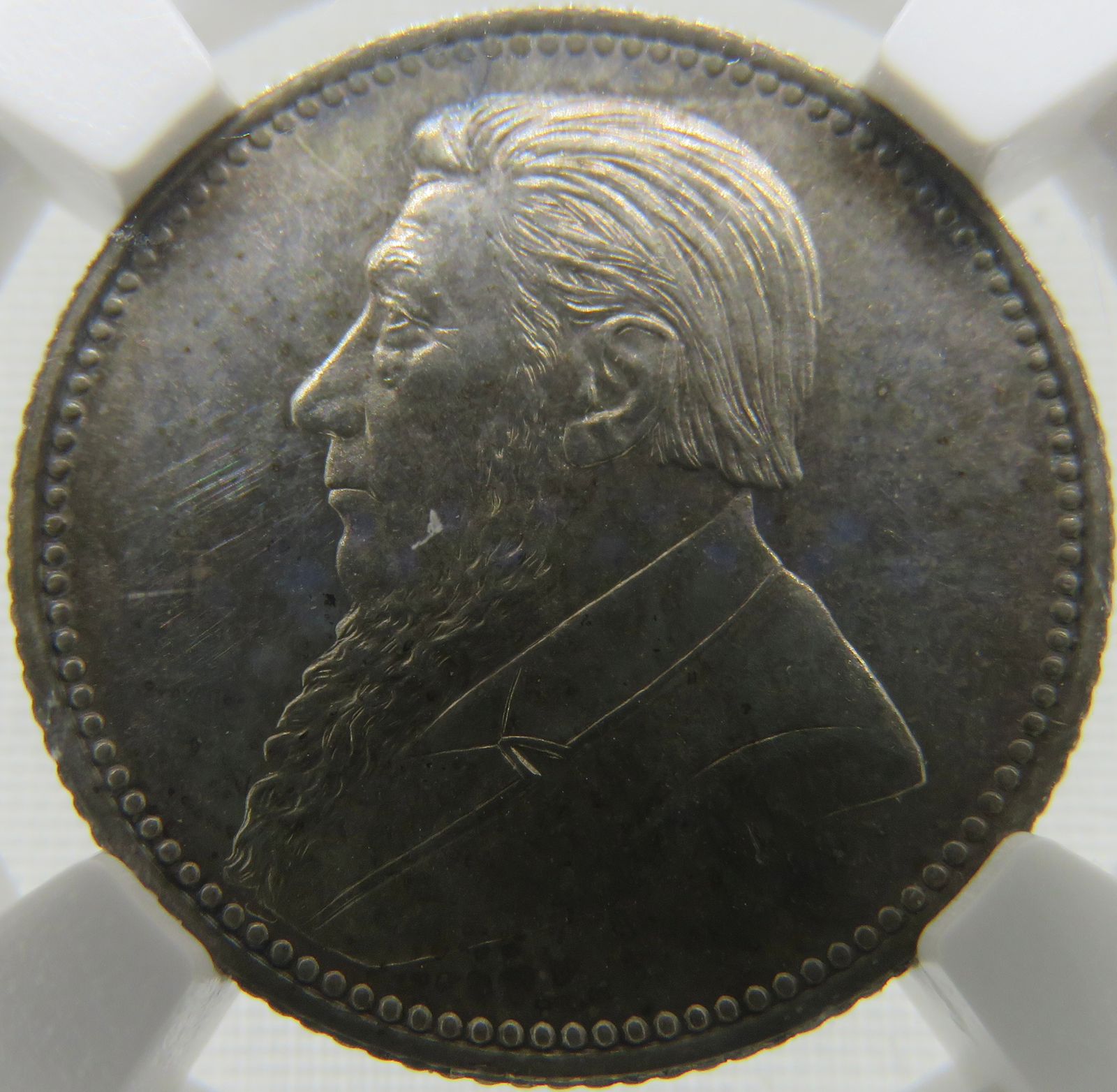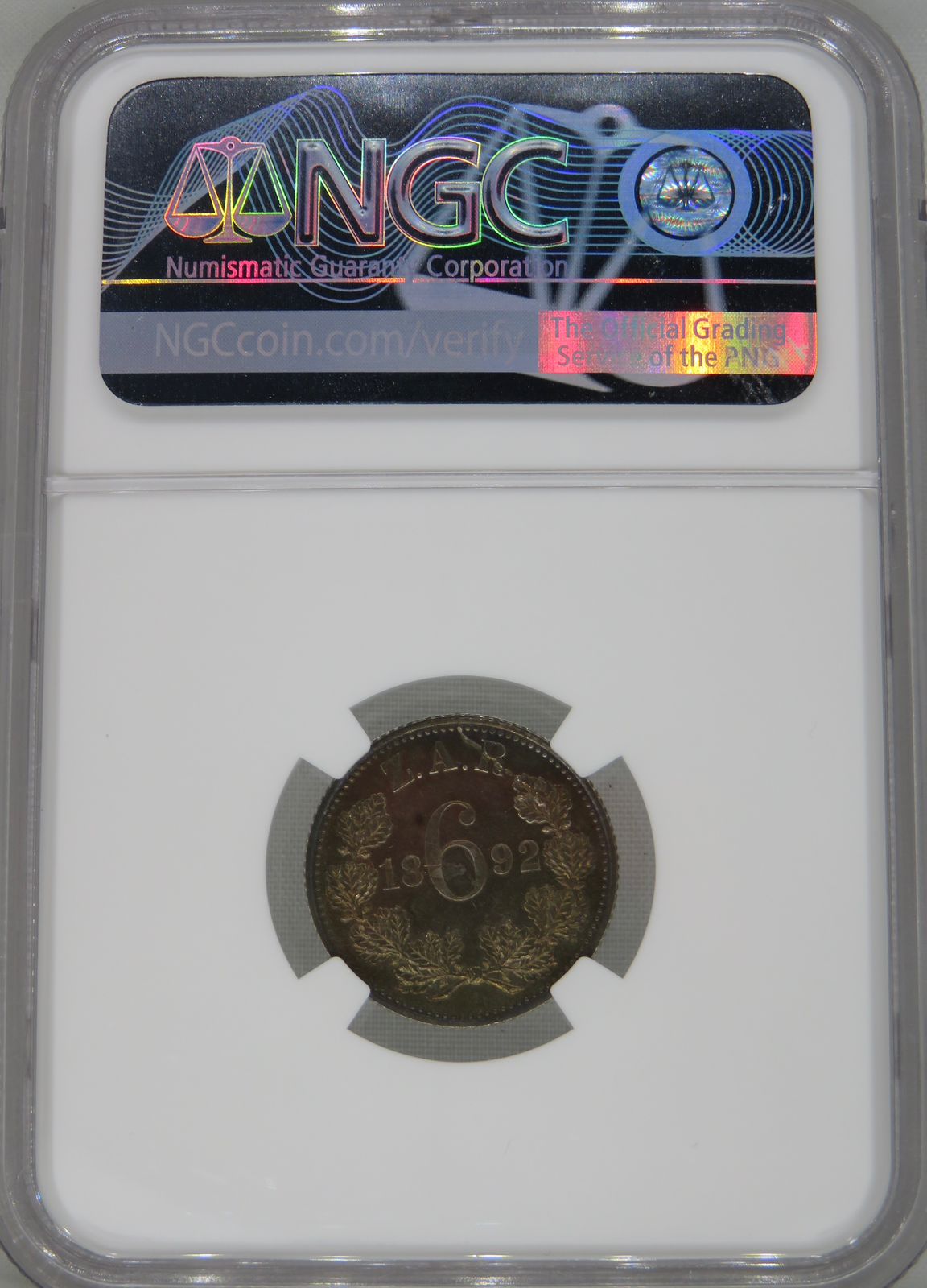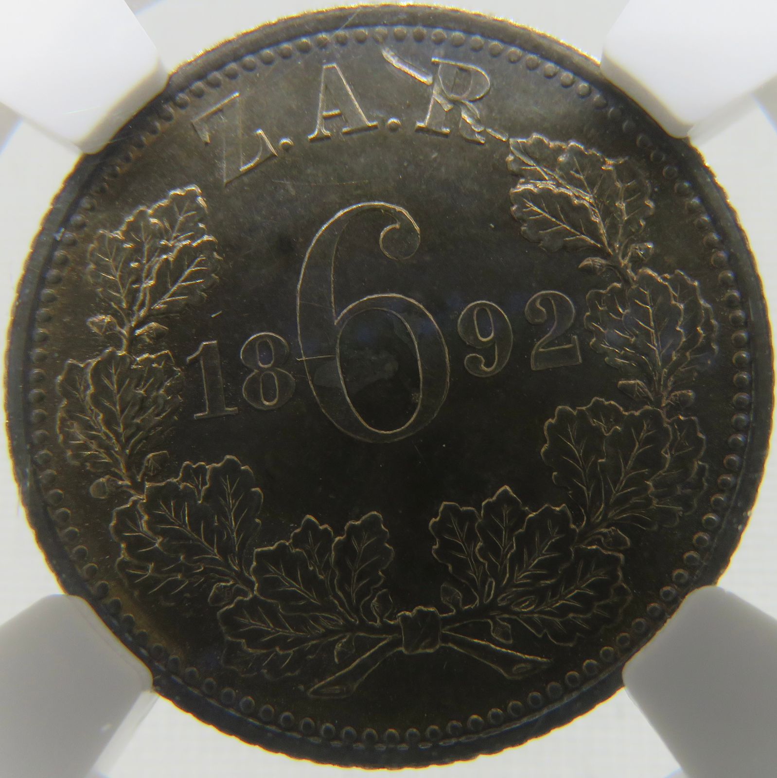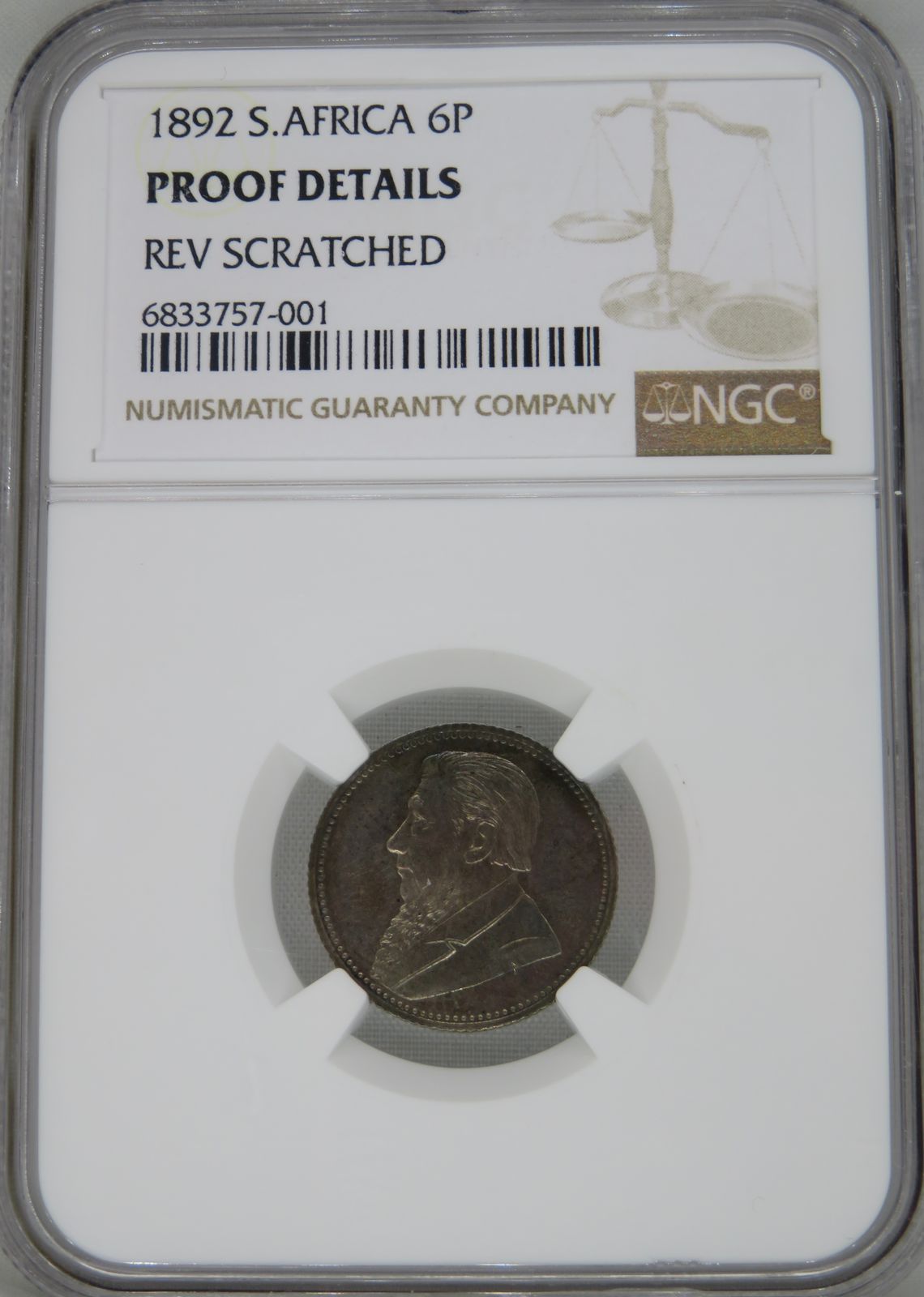 Lot 9: South Africa: Paul Kruger ZAR silver 6 pence of 1892 Proof Details NGC. Mintage: 50. Rare Proof. Reverse Scratched. Hern’s Price Proof: R60,000. Sold @ R7,100.