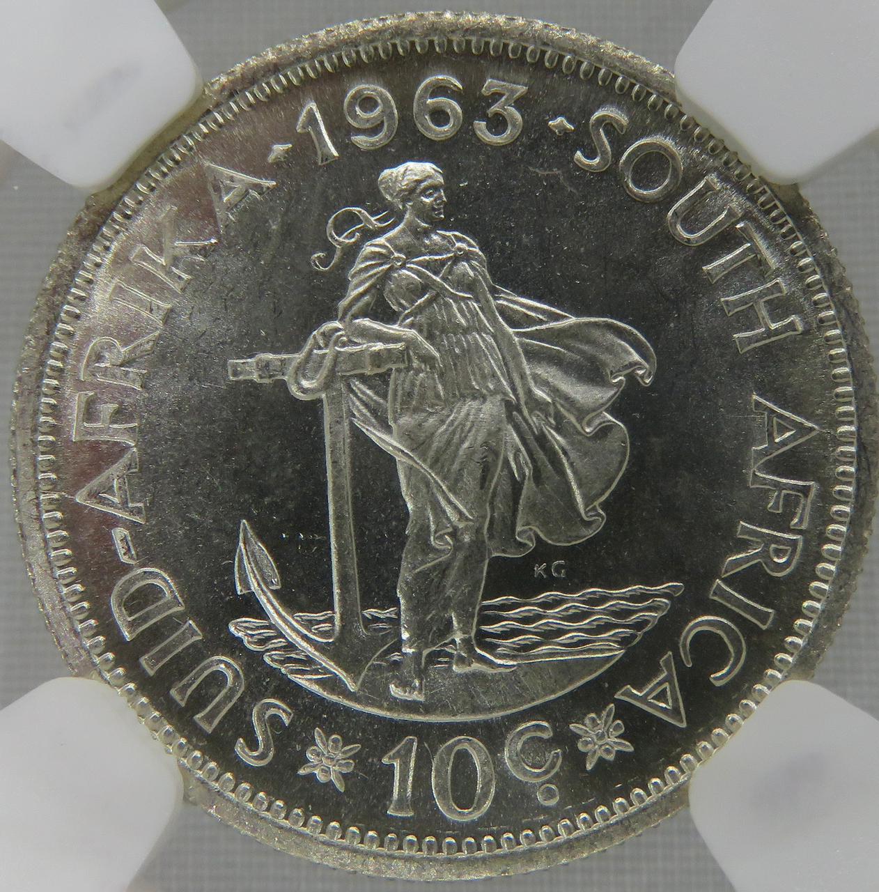 Lot 9: South Africa: Republic Silver 10 Cents of 1963 MS 65 NGC.